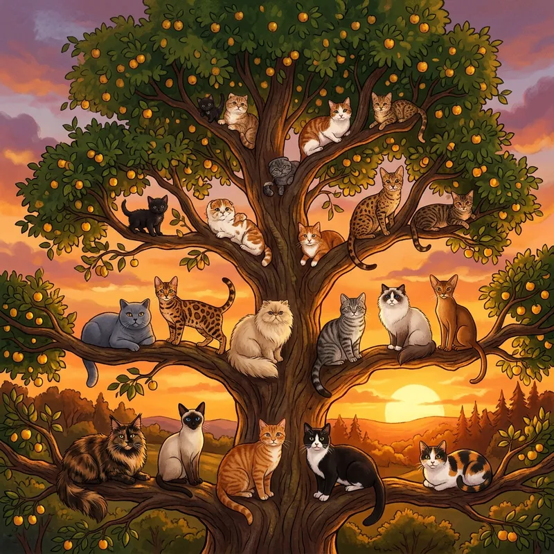 An illustration of a diverse range of felines perched on various tiers of a looming tree. The cats have distinctive coats of varied patterns and colors and are of different breeds. The tree is tall and sturdy with verdant leaves, dotted with golden fruits. The entire setting is lit up by the mellow orange glow of the setting sun in the background.