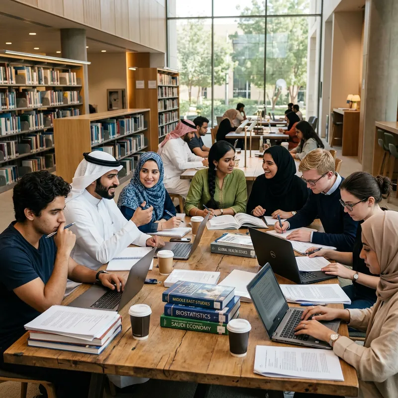 A scene depicting a diverse group of graduate students in Saudi Arabia. They are of varying descents, including Middle-Eastern, Caucasian, South Asian, and Hispanic. The group includes both genders, males and females. These studious individuals are in a modern university library, sitting around a wooden study table adorned with laptops, research books, and academic materials. A few students are in thoughtful poses, holding pens in their hands and looking at their laptops, while others are engrossed in conversation, exchanging ideas and discussing their research projects.