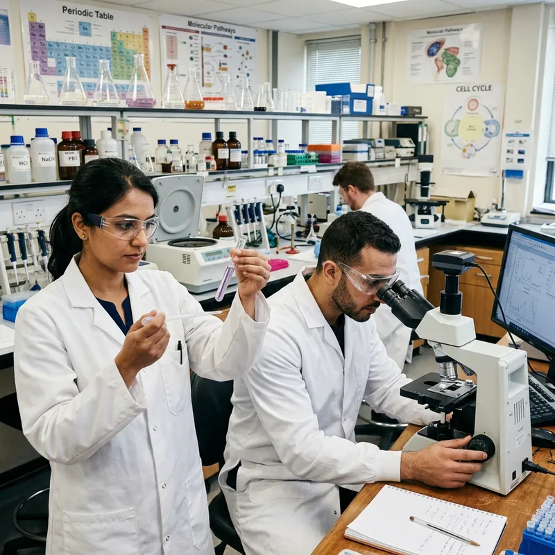 An image displaying a diverse group of individuals engaged in scientific research. The first person is a South Asian female scientist examining a test tube in her hands. She's wearing safety goggles and a white lab coat. The second person is a Middle-Eastern male scientist, using a microscope to observe a sample. He's also dressed in a lab coat. The background features a well-equipped lab with multitude of tools like beakers, flasks, and scientific charts.