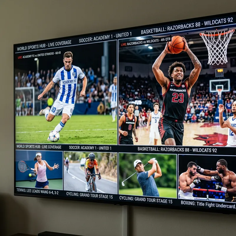 Generate an image of a screen displaying various sports content. The screen should be displaying a soccer match on one side, with a Caucasian player striking the ball with intense focus on his face. On the other side, a basketball match should be featured, showcasing a Black player about to make a slam dunk with a determined expression. Other smaller windows can be seen as well, showing athletes of various sports, such as tennis, cycling, golf, and boxing, representing different genders and descents to portray the diversity within these sports.