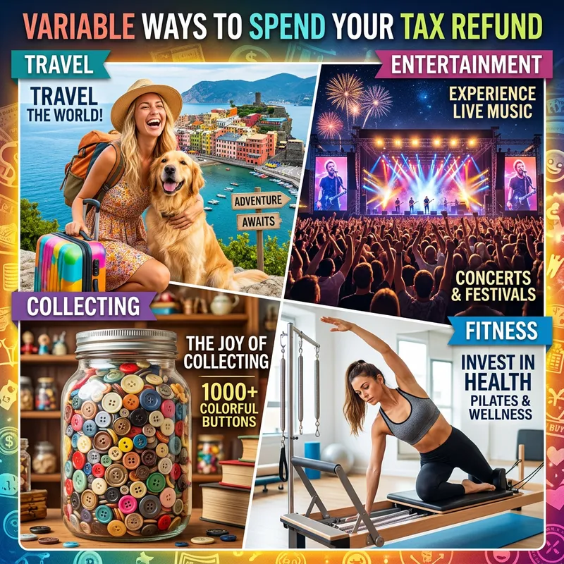 Create a conceptual image representing variable ways to spend a tax refund. Details should include: a jubilant person with a suitcase and a playful dog, standing in front of a picturesque tourist destination; a giant glass jar filled to the brim with 1000 colorful buttons; a focused individual in workout attire mid-way through a Pilates exercise; and an ecstatic crowd enjoying a live concert under a night sky filled with dazzling lights. Each scene showcases the choice of spending - travelling, collecting, personal fitness, and musical entertainment.