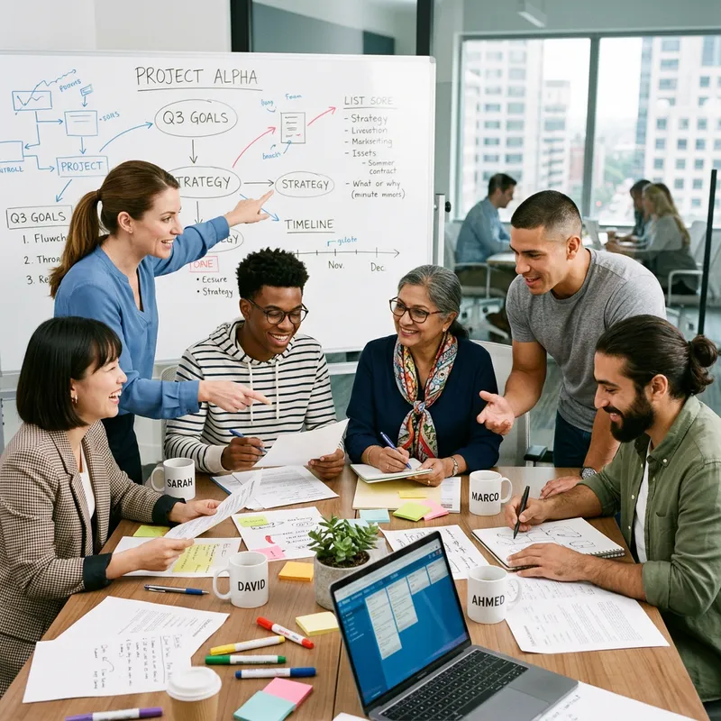 An assorted group of people engrossed in a team-building activity. The team consists of six members: a Caucasian female project manager with brown hair tied in a ponytail, a youthful Black male software developer with glasses and short curly hair, a mature South Asian female accountant with a scarf around her neck, an athletic Hispanic male event planner with a crew cut, a Middle-Eastern male graphic designer with a beard and long hair, and an eastern Asian female marketer with a bob haircut. They are huddled around a table filled with papers, a whiteboard with strategies scribbled, and cups of coffee.