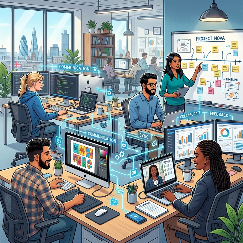 An illustration of a diverse team of professionals from various fields, networked together. To clarify, the team consists of a Caucasian female software developer, a Hispanic male graphic designer, a Black female HR manager, a Middle-Eastern male market researcher, and a South Asian female project manager. They are in a modern office space, each at their own workstation. They are all connected by digital lines indicative of a communication network, through their computers and smartphones. They are working diligently, reflecting a sense of harmony, robust collaboration, and seamless teamwork in a well-lit, colorful, tech-oriented setting.