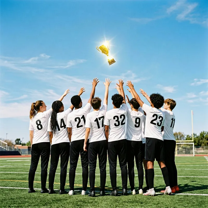 Generate an image of a group of diverse teenager boys and girls, standing with their backs to us. They're wearing white soccer jerseys and black trousers, attempting to reach a flying golden trophy. They are in the midst of a soccer field, not a rugby one. The sky above them is vast and clear, symbolizing their dreams and aspirations. Their jerseys are marked with random numbers and don't bear any recognizable football club symbols or logos. The golden trophy shines brightly in the sunlight, adding a magical touch to the scene.