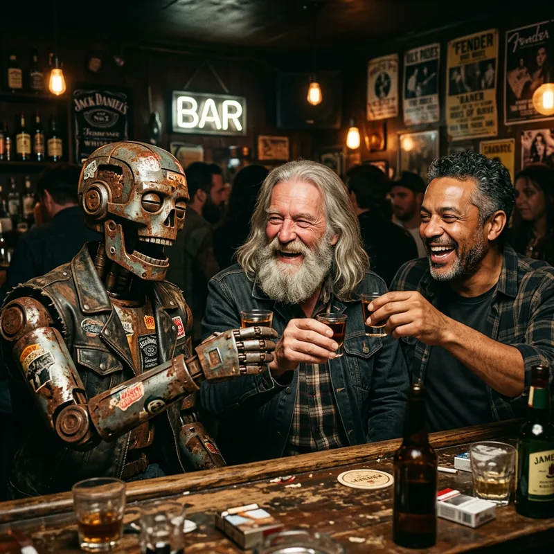 Analog-style photo of a three-piece acoustic band consisting of diverse members taking a break at a dimly lit bar, laughing and enjoying a shot of liquor. The members include a rusty metal humanoid robot showing signs of wear and tear symbolizing the rough rock and roll lifestyle, an elderly man of European descent with long flowing grey hair and a full beard, and a middle-aged man of mixed descent in his early 40s with short facial hair, brown hair, and a hint of grey.