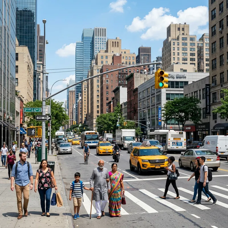 A busy traffic scene during the day. A mix of different vehicles moving in an orderly manner on wide streets of an urban city. Pedestrians of various descents and genders such as Caucasian men, Hispanic women, Middle-Eastern children, and South Asian elderly are walking on sidewalks. Buildings of various architectural designs can be seen in the background. Overhead, a clear blue sky with a few fluffy white clouds.