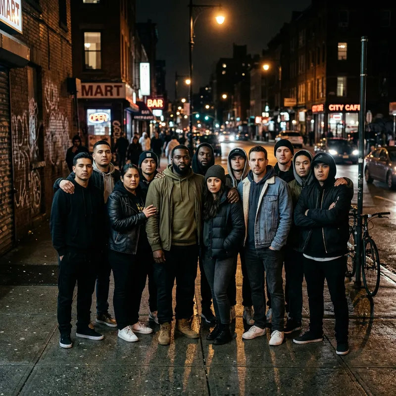 Illustrate a group of people, dressed in modern urban attire, congregating on a city street at night. They are a diverse group, with people of various descents such as Hispanic, Black, and Caucasian equally represented. They exude a sense of unity and strength, their expressions serious yet filled with camaraderie. Soft street lights cast delicate shadows, adding intrigue to the scene.