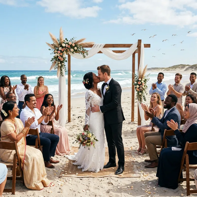 A diverse wedding scenario on a sandy beach under a clear blue sky. Multiple people of differing races including Black, Hispanic, Caucasian, South Asian, and Middle-Eastern are applauding heartily. The focal point of the scene is a joyous moment where a Black bride and a Caucasian groom are sharing a loving kiss. The bride is wearing a beautiful white lace dress, while the groom is in a sleek black suit. The guests are tastefully dressed in semi-formal attire. Seagulls fly overhead while the gentle ocean waves crash in the distance.
