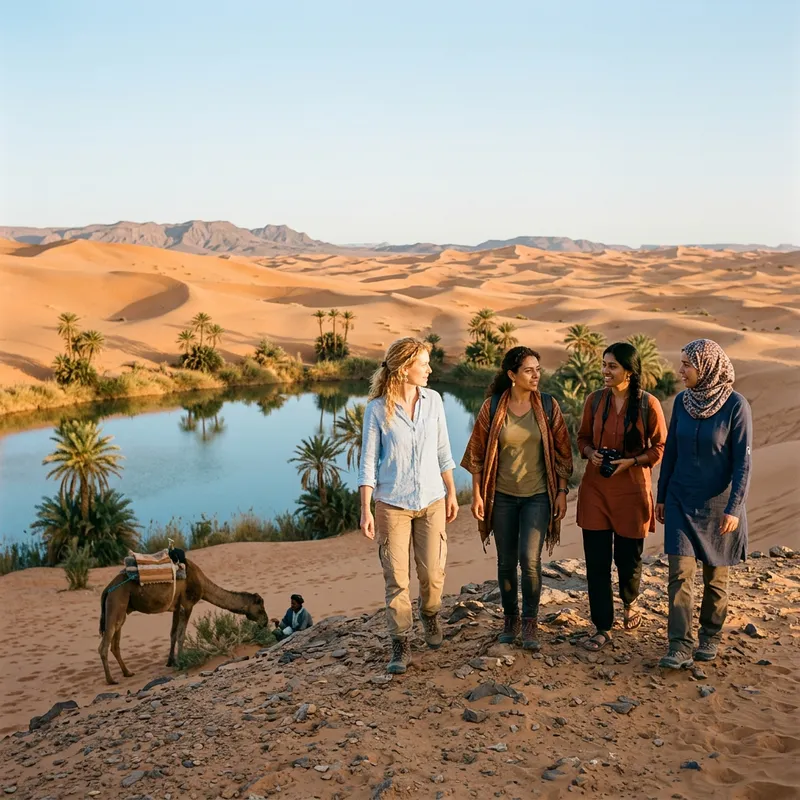 A serene desert landscape showcasing a quartet of beautiful women diverse in ethnicity. One woman is of Caucasian descent, another is of Hispanic descent, the third is of South Asian descent, and the fourth is of Middle Eastern descent. They are exploring the rugged terrain, the untamed beauty reflecting in their eyes. To add intrigue, a camel is grazing nearby as the emblem of the desert. A blue-tinted, serene lake exists at the center of this scene, shimmering under the desert sun. This image combines human diversity and natural beauty in the heart of a desert.
