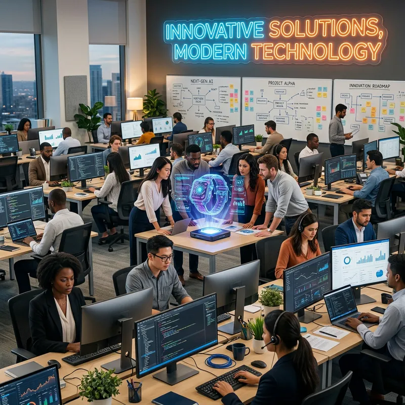 A busy open-plan office filled with diverse employees immersed in their work. There are Caucasian, Hispanic, Asian, and Black men and women, all wearing a balance of formal and casual attire. Workstations are equipped with advanced computer systems displaying charts and analytical data. On the walls, interactive whiteboards show brainstorming sessions and technological breakthroughs. In one corner, a team is collaborating around a holographic projection of a futuristic gadget. Above it all, a neon sign illuminates the room with 'Innovative Solutions, Modern Technology'.