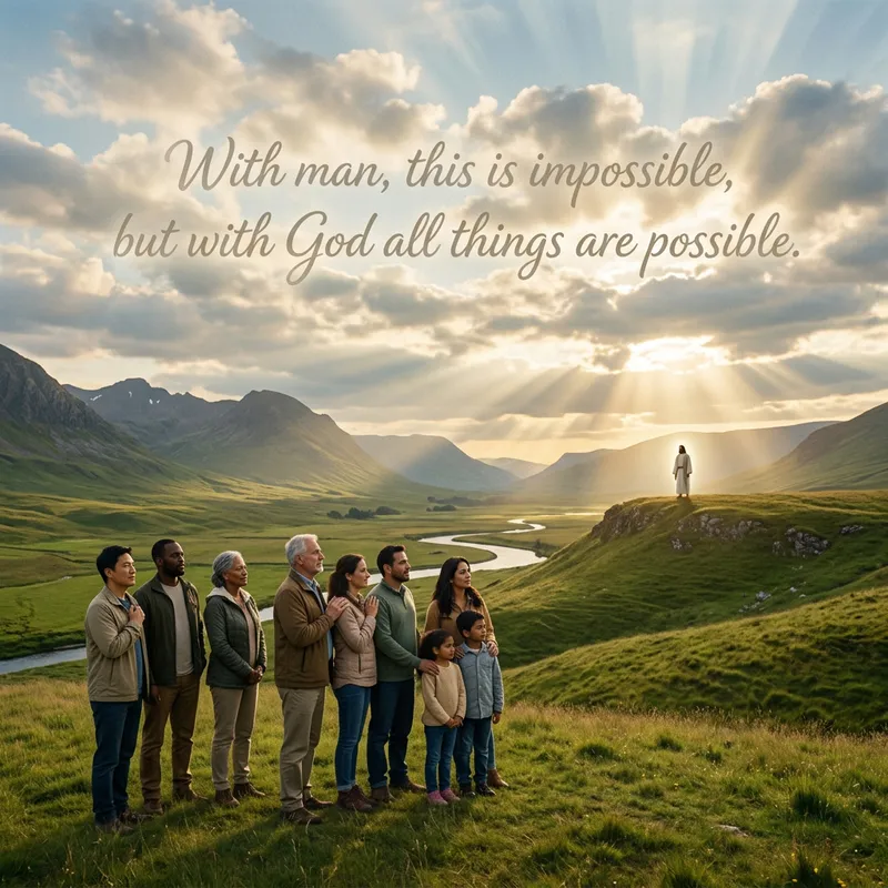 A serene landscape image with a prominent figure standing in the distance, possibly signifying a divine entity. In the foreground, a group of various individuals of different descents and genders stand together, looking towards this figure. The basis of the scene is peaceful, with visible rays of sunlight streaming through the clouds, embodying a celestial aura. The inscription, 'With man, this is impossible, but with God all things are possible,' appears artistically in the sky, perhaps shaped with the moving clouds, giving a sense of hope and assurance.
