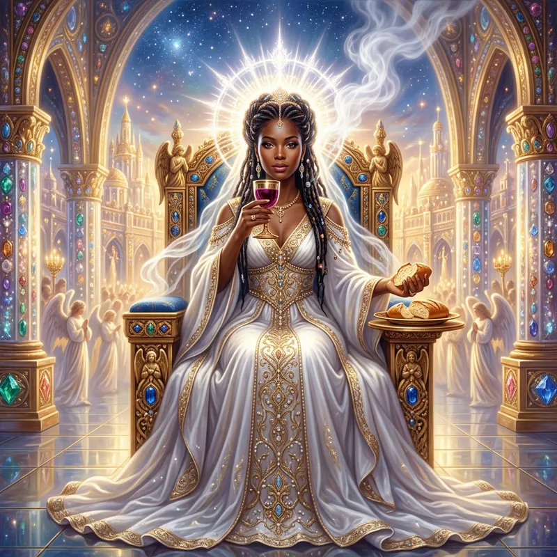 A luminous woman, depicted as a radiant light, sits in an intricately designed throne room that conjures images of a celestial New Jerusalem. She portrays the visage of a stunning Black woman with a halo of glowing light acting as her crown, which emits white smoke symbolizing the Holy Spirit. Her hair is styled in braids often seen among African American women. Her attire is a flowing white gown reminiscent of those seen in high-end fashion but not specifically attributed to any particular designer. She partakes in communion, symbolically consuming red wine and bread.