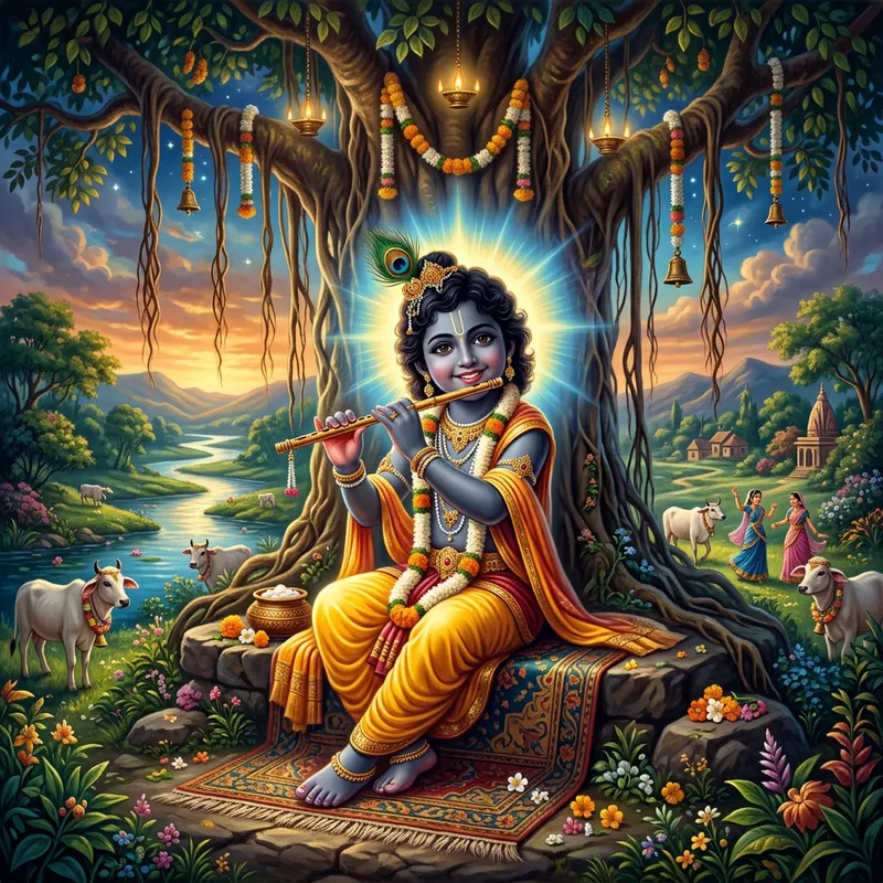 A visually captivating representation of Lord Krishna as a child. Illustrate him as a playful character donned in a traditional Indian attire with a divine aura emanating from him. He is depicted with his flute, often found playing the melodious tunes captivating his surroundings. The image maintains a celestial ambiance, reflecting his spiritual influence. He is positioned under a beautiful Banyan tree, with the scenery below filled with lush green nature.