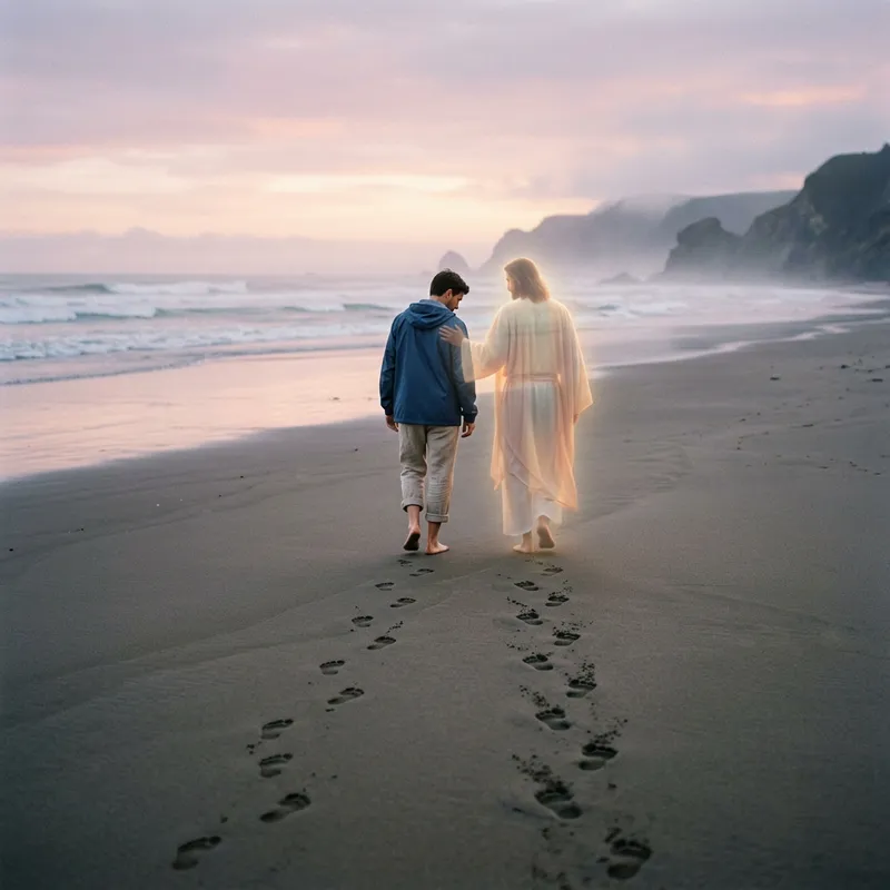 Imagine a serene coastal scene. You are strolling along the shore, accompanied by a divine, ethereal figure symbolizing a higher power. As you progress, the dual footprints in the soft, damp sand transform into a single set. This symbolizes the concept that in tough times, one is not alone but carried forward by this guiding light.