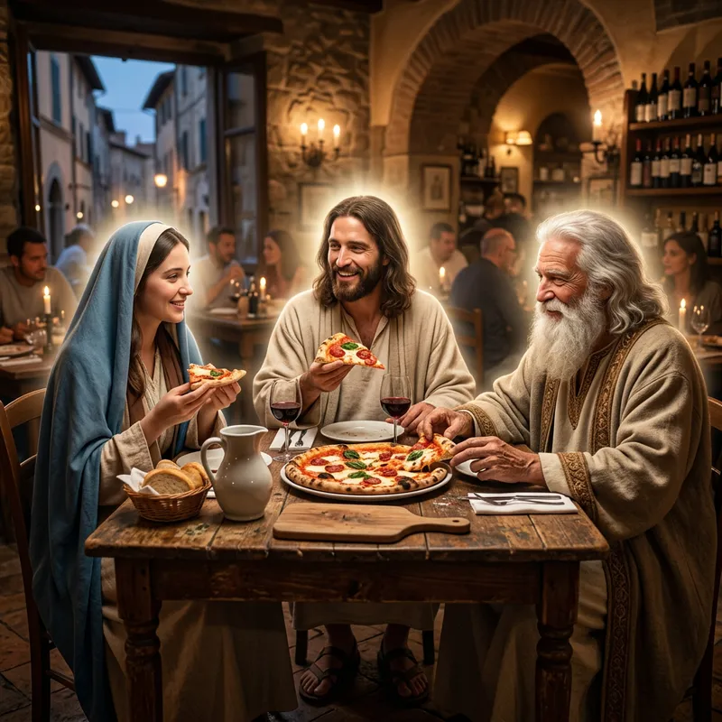 Divine Pizza Gathering: Jesus, Mary, and God Share a Meal