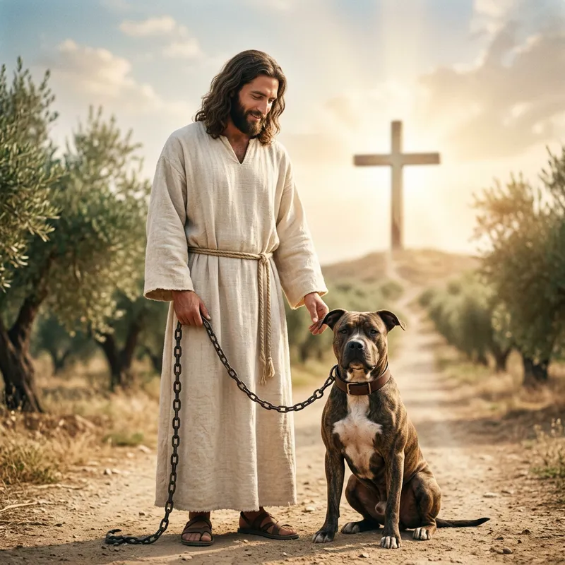 A man resembling the traditional depiction of Jesus, with long hair and a white robe, holding a muscular pit bull on a chain leash. The pit bull displays a calm demeanor, its muscles subtly highlighting its strength. In the background, a cross can be seen, radiating with divine light, enhancing an aura of peace and compassion over the scene.