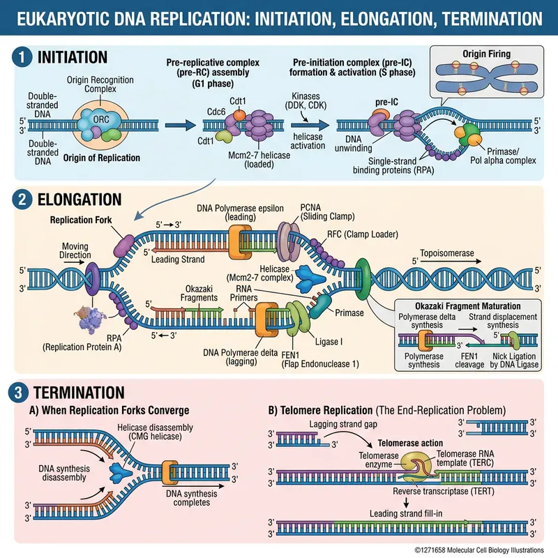 Dna replication including initiation, elongation and termination in eukaryotes