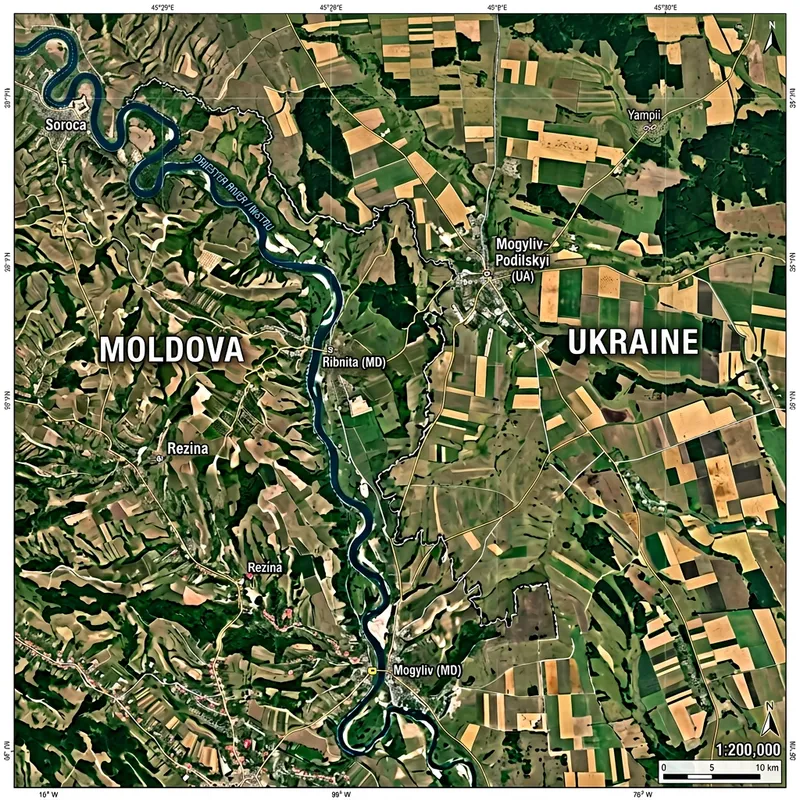 High-quality view of the Dniester River from a top-down perspective, as if looking at a map. To the right of the river is Ukraine, characterized by its distinct landscape, and to the left is Moldova, defined by its unique terrain. Both countries are visually distinguishable by their distinctive geographical features.
