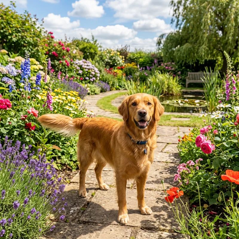 A dog standing in a lovely garden, surrounded by different types of flowers. It has a shiny coat and its tail is wagging with joy. The sun shines brightly in the sky and a few clouds are scattered around. The garden path meanders around the area, and a small pond can be seen in the distance. The dog is looking at the camera with interest, its eyes sparkling with intelligence and curiosity.