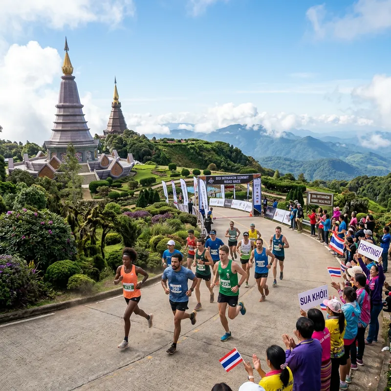 A scene capturing a road running race taking place at the peak of Doi Inthanon, the highest mountain in Thailand. A diverse group of athletes, embodying a range of genders and descents, from Caucasian to Hispanic and Black, can be seen energetically striding along the winding road. High elevation flora color the landscape with hues of green, catering a refreshing contrast against the cloud-kissed blue sky. Spectators, in a mix of descents, stand along the course cheering the runners. The grandeur of Thai architectural structures and pagodas provide an intricate cultural backdrop to this spirited event.