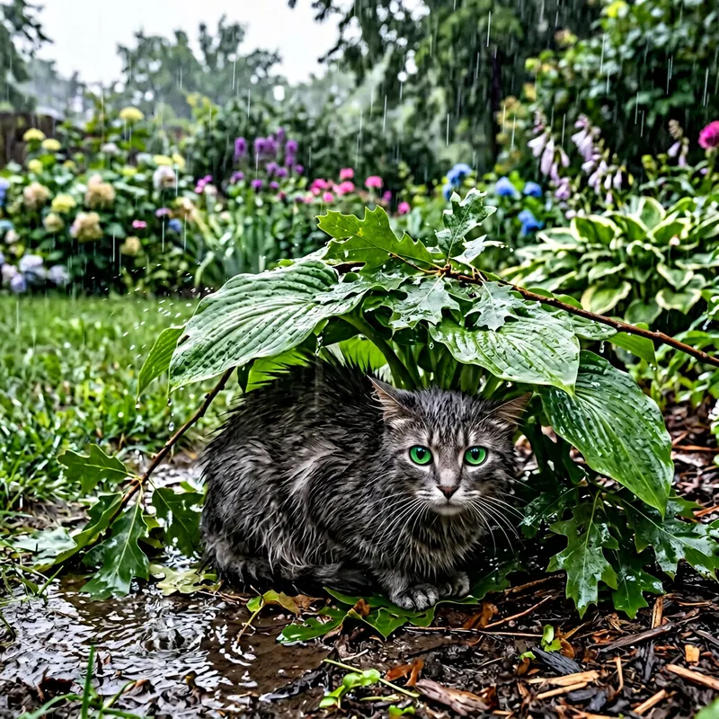 A domestic cat, with its fur standing on end, taking shelter under a makeshift canopy of leaves during a steady downpour of rain. The backdrop of the scene is a simple suburban garden with wet grass and flowers. The cat's eyes are a brilliant green, contrasting against its wet, gray coat. The raindrops are splattering onto the leaves and the ground around the cat, creating a symphony of soft, pitter-patter sounds.