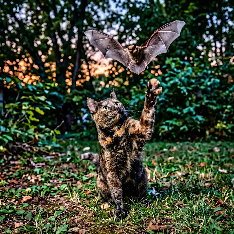 An image of a domestic shorthaired cat playing with a bat. The cat is standing on its hind legs, curiosity sparkling in its eyes. The cat is swatting at the bat with paw. The bat is overhead, wings spread wide, displaying all the intricate skeletal structure. The setting is a backyard at dusk, with trees providing a natural backdrop, giving the scene a touch of wilderness.