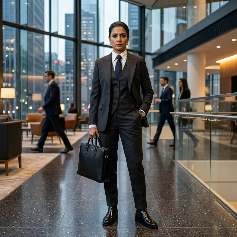 A stern-looking woman in a high-end professional setting. She wears a sharply tailored suit, crisp white blouse, and shiny black leather boots. She holds a sophisticated-looking black leather briefcase and stands in a stance that exudes authority and confidence. She has a South Asian descent and dark hair combed slickly back. The atmosphere around her is intense, and she seems to be in a position of power and control.