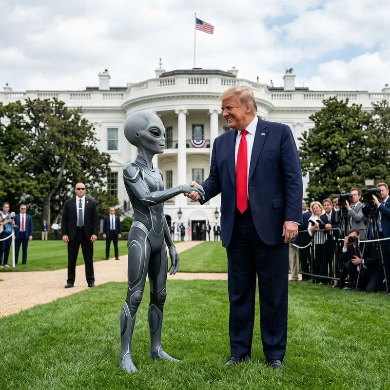Donald Trump shaking hands with a grey alien on the White House lawn.