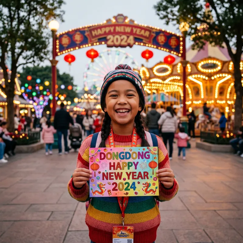 An image capturing a joyous moment in a family-friendly theme park, showcasing a young girl, of unmentioned descent, smiling enthusiastically as she holds up a brightly decorated card with the festive text, ‘Dongdong Happy New Year 2024’. The lighting around her incites a cinematic ambiance, enhancing her figure. This image was crafted to look like it was high quality as if shot on a mirrorless camera.