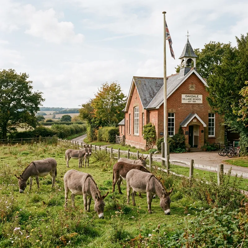 Several donkeys located near an old school building. The school is made of red brick, with a tall flagpole out front and large windows. The donkeys are grazing peacefully in an open field adjacent to the school, their soft gray and brown coats blending with the greens and browns of nature. Some of the donkeys are busy eating while some are gazing towards the distance. The scene is quiet and serene, bringing an image of country life to mind.