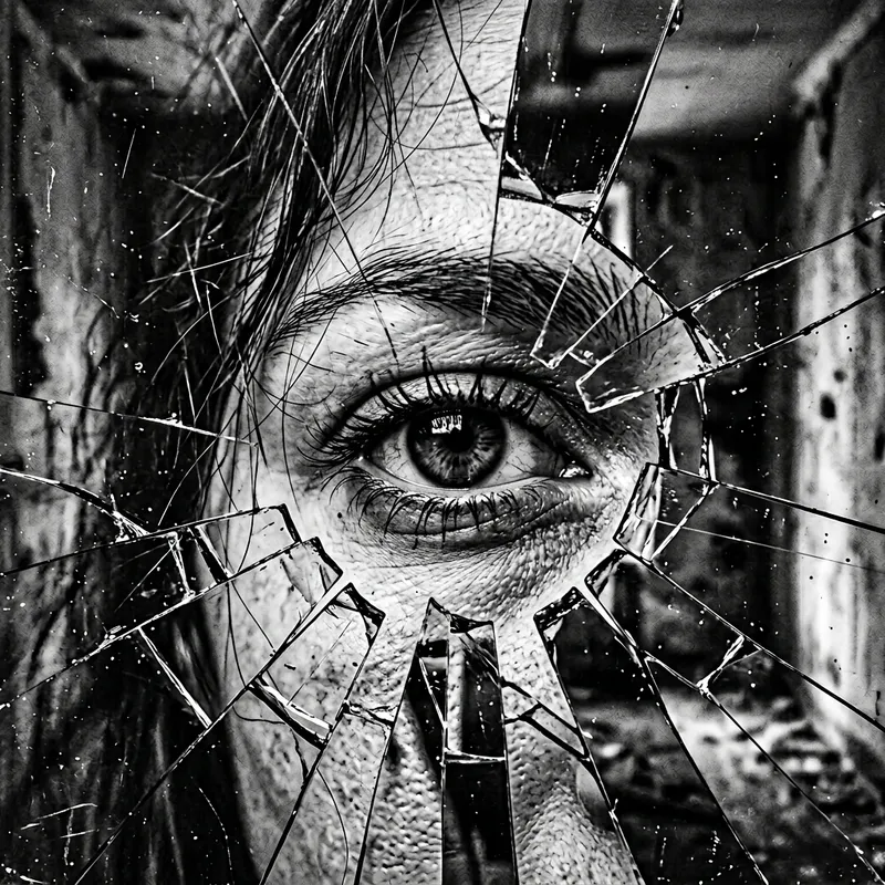 Double exposure photo featuring a close-up view of an eye and a shattered mirror effect. The broken mirror is characterized by sharp edges and ephemeral shadows that add a sense of motion-infused mystique. These elements are presented in a style that evokes a haunting allure, reminiscent of the candid realism and American societal commentary observed in mid-20th century black-and-white photography.