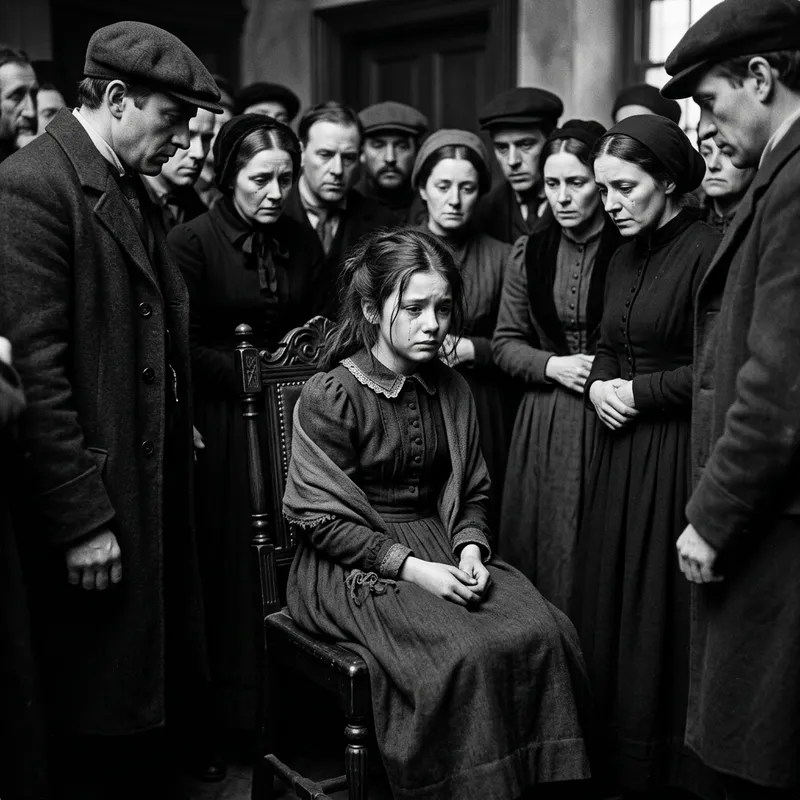 In a high contrast image resembling that of a dramatic black and white photograph, a young girl is clad in a Victorian-era dress and sat on an antique wooden chair. Her face, marked with expressive features, is dampened by tears cascading down her cheeks. An attentive crowd engulfs her, their gazes fixed intently on her. The scene bears the aesthetics of a carefully composed studio portrait, filled with emotion.