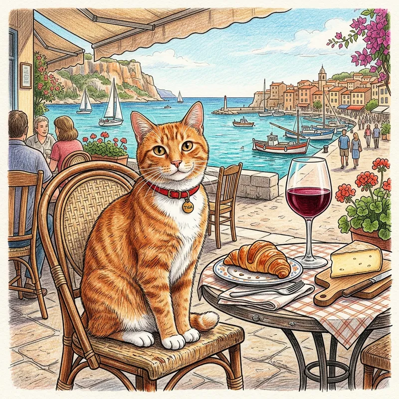 Draw a ginger tomcat with white chest and tiptoes, in red collar. Sitting in a French cafe, on the seaside. Large glass of wine, one croissant and a slice of cheese are sitting on the table. Colored pencils and inks.