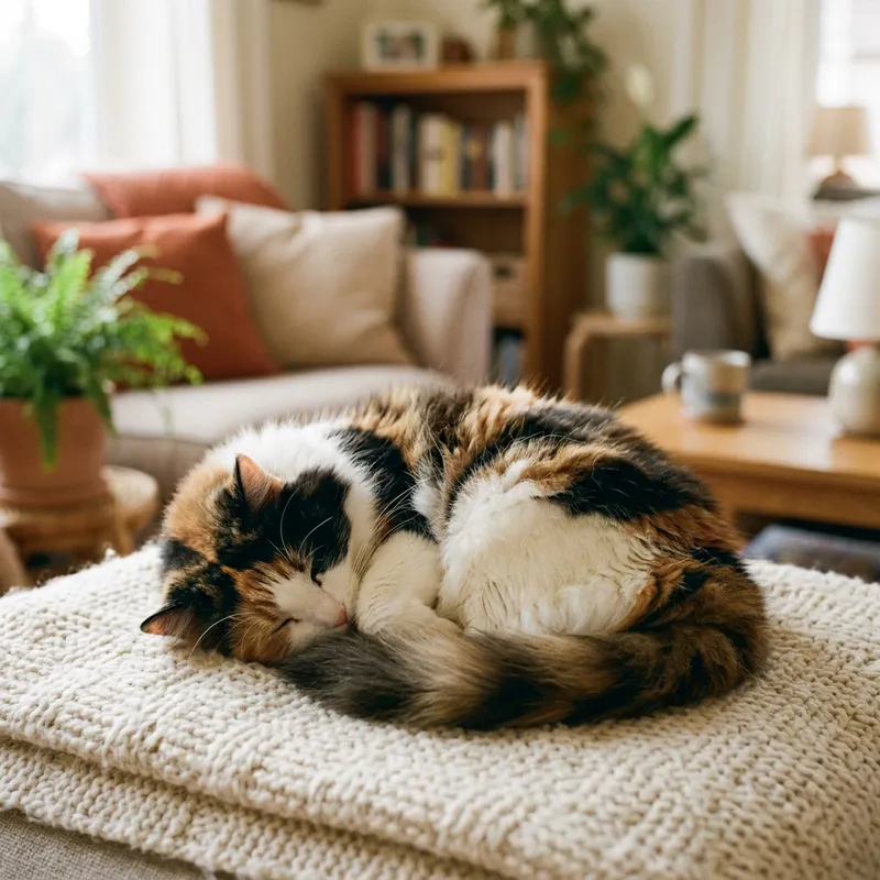 Draw a cat peacefully sleeping with its body curled into a round shape. The cat's fur is fluffy and of a calico pattern, with the main colors being white, black, and caramel. The background is a comfortable living room setting with warm out-of-focus colors, giving off a homely and cozy feel.