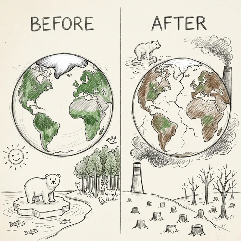Create a simple yet impactful drawing showcasing the concept of the world before and after climate change. The drawing should be done in an amateur style, employing pencil sketches on paper as the medium. Key elements should symbolize our earth, endangered animals shown in peril, melting polar ice caps, and visible deforestation. Despite the basic style, the objective is to express the stern and pressing nature of worldwide environmental changes.