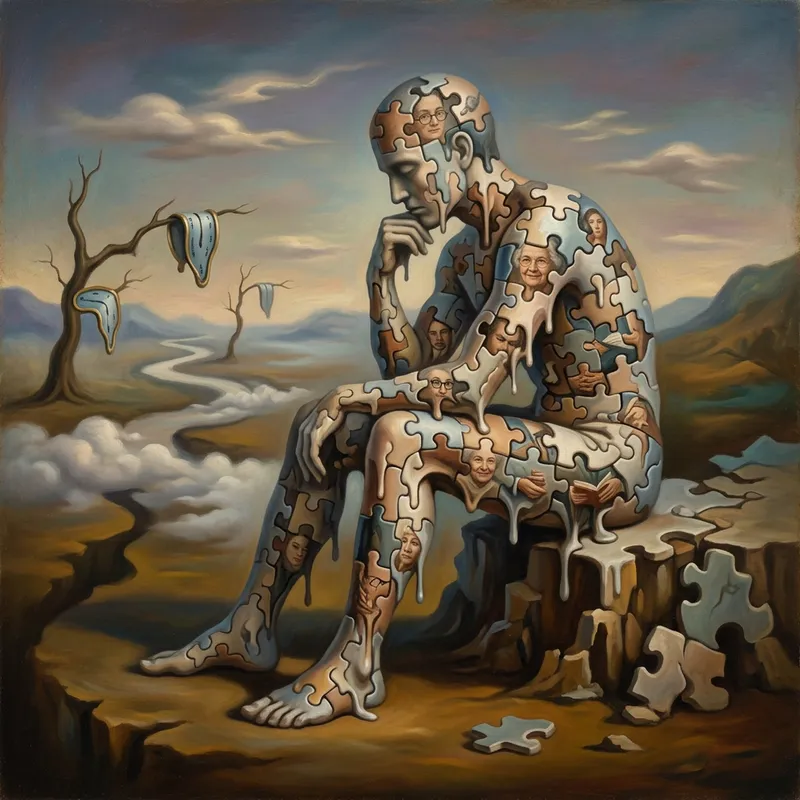 Create an image in a dream-like surrealistic style, with melting elements reminiscent of artwork from the early 20th century. The scene should symbolize how we are all mosaics and compose of pieces of every individual that has influenced our lives. This should be symbolized by different fragmented, melting puzzle pieces, each representing different people, merging together to form a single cohesive identity.