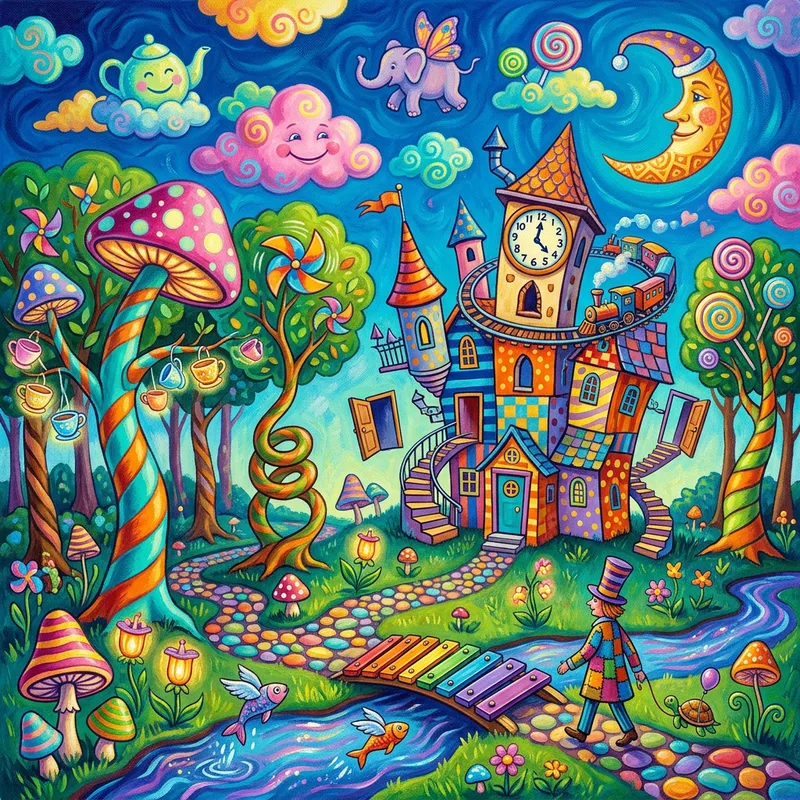 Create an image in a painting or illustration style that represents a scene filled with quirky and surreal elements. For instance, it could be a dreamlike forest with trees morphing into strange shapes, the sky populated with bizarre clouds, or an eccentric building exhibiting illogical architecture. The colors utilized in the image should be bright and vibrant to accentuate its absurd and surrealist atmosphere.