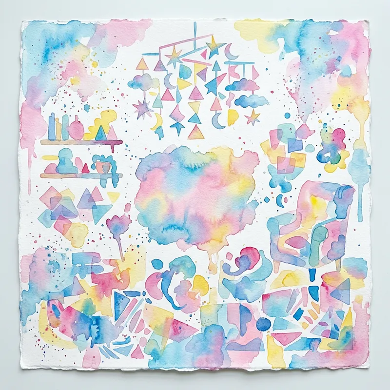 Create an abstract baby room filled with whimsical shapes and vibrant colors. The scene should be painted in soft watercolor brushstrokes, conveying a dreamy and playful atmosphere. Use a palette of pastel blues, pinks, and yellows, random splashes giving the image a colorful and joyful ambiance. The final image should emulate the quality of an art print on a high-quality watercolor paper, the theme being inspired by nursery decorations and graphics.