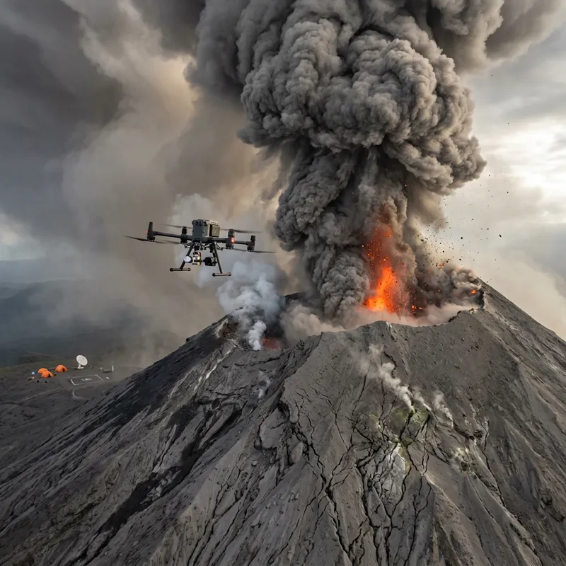 Original Prompt: drone volando en volcán a punto de erupcionar