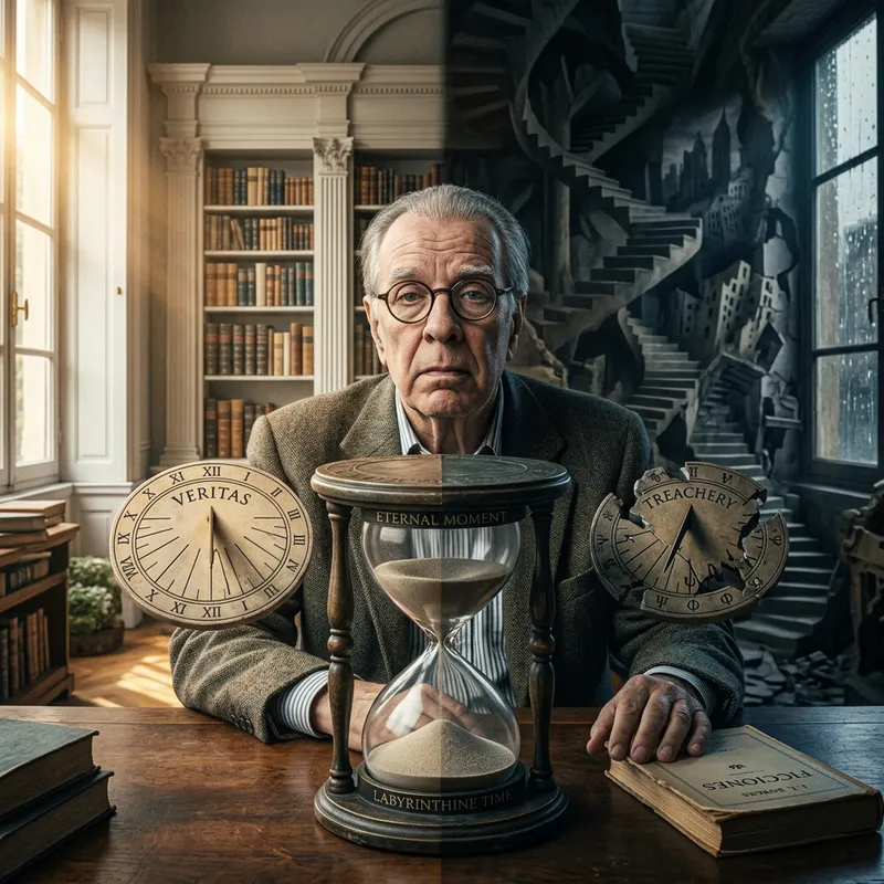 Depict the concept of dualism pertaining to reality, time, truth and betrayal, according to the philosophical views of a renowned 20th century Argentine writer. Include temporal symbolism like an hourglass or a sundial with two sides representing the truth and the betrayal. Let the two different realities coexist side by side, represented by contrasting environments.