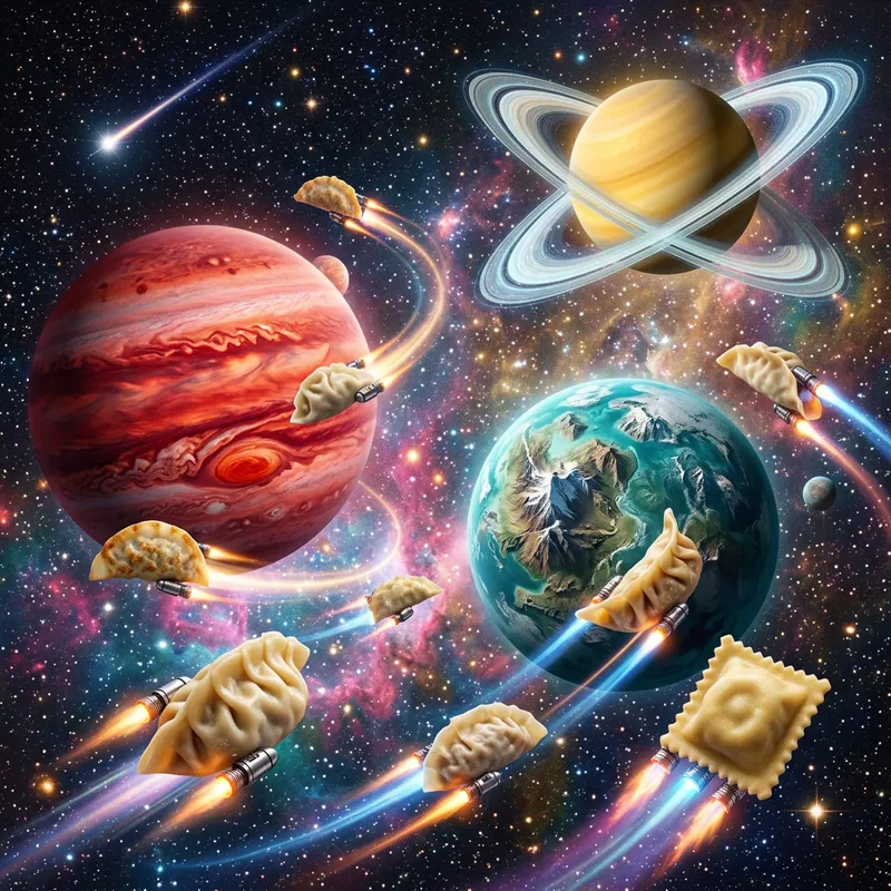 Dumplings are drifting in space, each with tiny rocket propellers and light trails, demonstrating their movement. They're whirling among a multitude of colorful planets, distant stars, and glowing nebulae. Some of the celestial objects they pass by include a red gas giant with mysterious storms, a rocky turquoise world with towering mountains, and a golden planet with rings like Saturn. Periodically, a shooting star streaks across the vast expanse. Despite the emptiness of space, there's a sense of whimsical adventure and exploration emanating from these cosmic cuisine explorers.