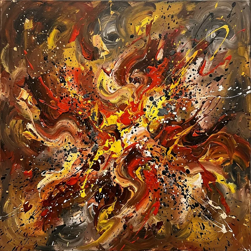 An abstract representation of a dust explosion, with swirling hues of brown, yellow, and red capturing the dynamic motion and intense energy of the phenomenon. Black and white specks can be seen as if representing individual dust particles caught in the moment of detonation. The whole scenario is artistically composed in a way that showcases movement, chaos, and power typically associated with the Abstract Expressionist movement.