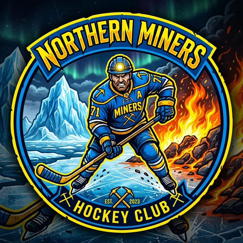 Design a vivid and striking hockey logo. The primary colors should be brilliant blue and bright yellow. The central motif should be a miner, showcasing resilience and intensity. Create a dynamic background that includes the chilling presence of an ice berg, contrasting with the intense power of fire flames. The depiction should maintain the excitement and energy associated with the sport of hockey.