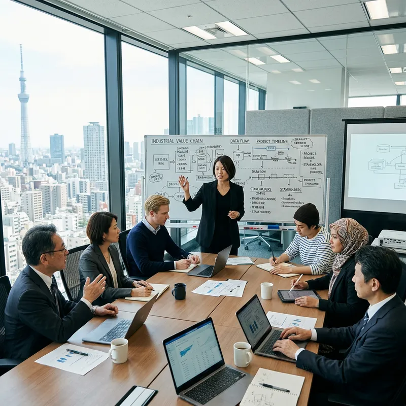 Envision a dynamic, modern office located in Tokyo, vibrant with the energy of a project planning session. The room features a large conference table strewn with state-of-the-art digital devices like laptops and tablets. At the forefront, a Japanese woman taking on the role of project manager leads the discussion, standing adjacent to a comprehensive whiteboard filled with intricate industrial value-chain diagrams and complex data flow charts. Six professionals contribute their insights around the table - two Japanese men serving as senior consultants, an Asian woman of Muslim descent working as a consultant, a blond Caucasian consultant, a Japanese designer adorned in casual attire, and a seasoned Japanese woman representing the client. The room's spaciousness is amplified by grand windows that open up to an impressive view of Tokyo's skyline, all encapsulating the essence of corporate project planning.