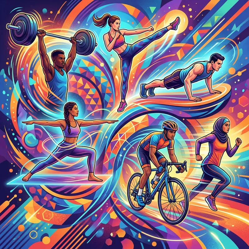 Create an illustration of a dynamic and flowing geometrical pattern that suggests motion and energy. The colors should be vibrant and inspiring, and the design should be intertwined with imagery of exercisers. Include various exercisers such as a Caucasian man doing a push-up, a Hispanic woman doing yoga, a Black man lifting weights, a Middle-Eastern woman running, a South Asian man cycling, and a White woman doing an aerobic exercise. The different movements should flow into a cohesive design that fully represents the energetic and dynamic nature of exercising.