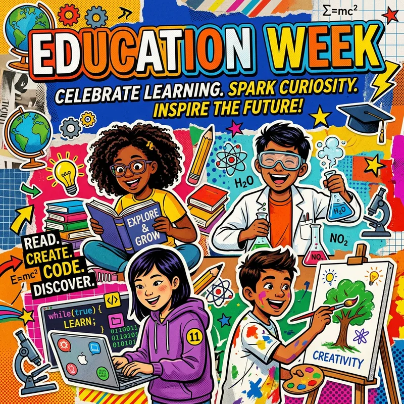 Education Week Poster: Diverse Students Engaged in Academic Activities
