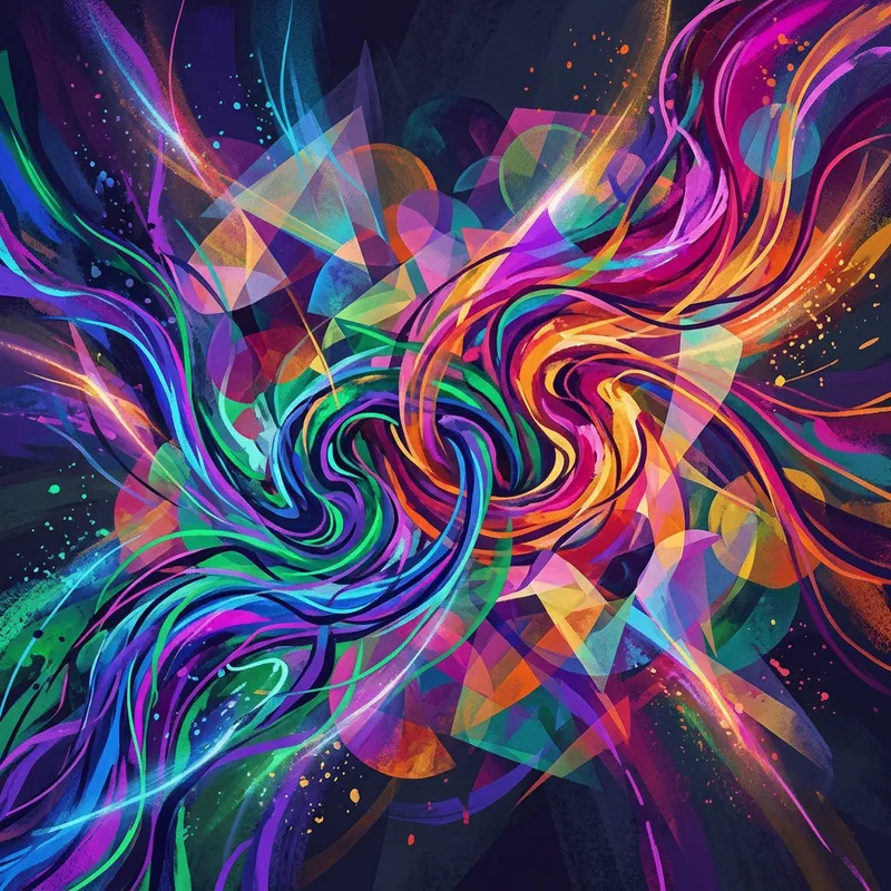 Visualize an abstract concept representing the exploration of transfer and counter-transfer, energized by a myriad of vibrant colors. The image should incorporate elements that evoke movement and change, potentially overlapping geometric shapes or fluid lines that intertwine and exchange positions, signifying the ongoing process of transfer and counter-transfer. These elements are expressed in a colour palette of intense and visually striking hues, creating a dynamic and evocative composition. This rich blend of colors and shapes forms an energetic and engaging visual journey, provoking thoughtful contemplation about the interplay of elements and the continuous dynamic of exchange and counter-exchange.