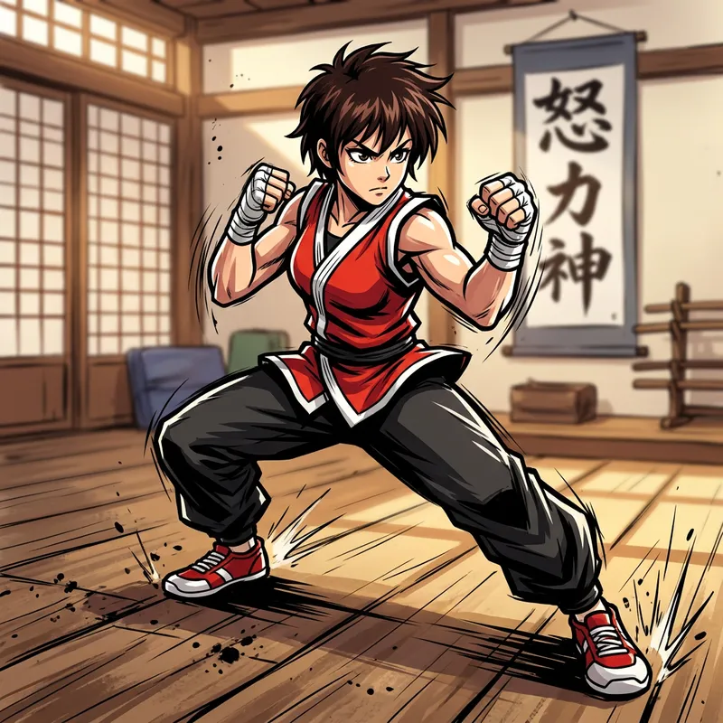 A female character with traits similar to Lynn from an unidentifiable manga series posing dramatically with her fists clenched, as if ready to spring into action. The image borrows inspiration from the aesthetics of traditional Japanese manga art characterized by vibrant colors and bold, expressive lines. A digitally painted image that uses a cel-shading effect to mimic the look of a hand-drawn style, resulting in flat colors with sharp shadows and bright highlights. The scene is filled with the energy and dynamism of martial arts.