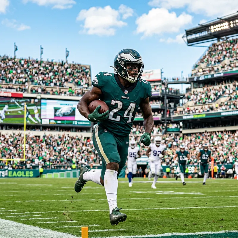 A Black male football player in his late twenties, wearing a green team uniform and a helmet. He's running on a grassy field, holding a brown leather football under his arm. The stadium is packed with cheering fans. The sky above is clear blue with some mild white fluffy clouds.