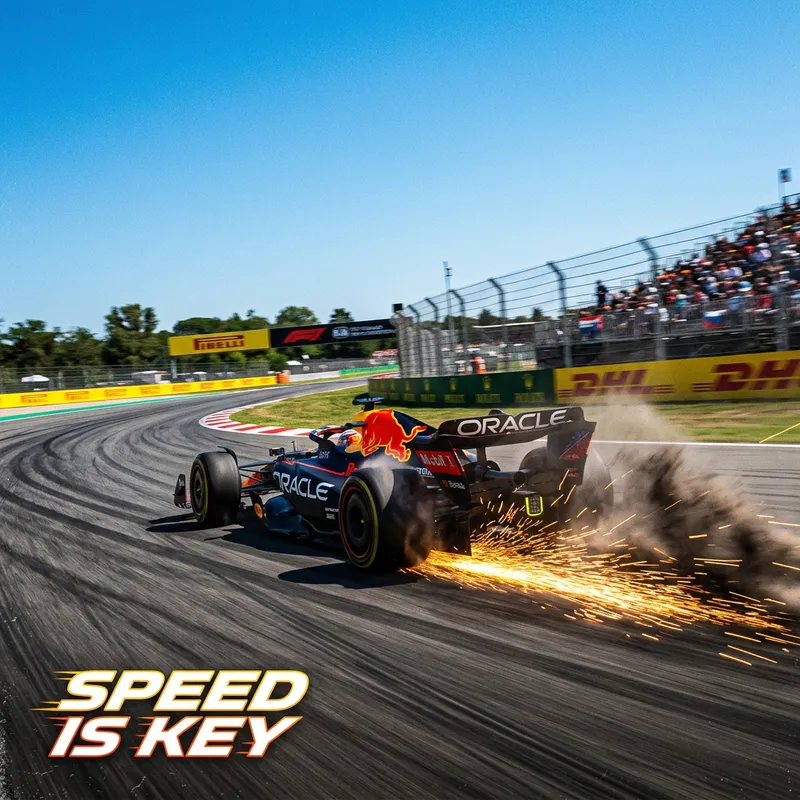 A poster showcasing a modern Formula 1 race car speeding along a racetrack. The car is shown from a dynamic side angle, making it look like it's moving at high speed, and kicking up dust from the track. Vibrant sparks fly from the back due to the friction of the tires. The skies above are cloudless and blue, contrasting the tarmac's grays. In one corner of the poster, a stylized text reads the words, 'Speed is Key'. The overall tone of the poster is designed to evoke the thrill and adrenaline of Formula 1 racing.
